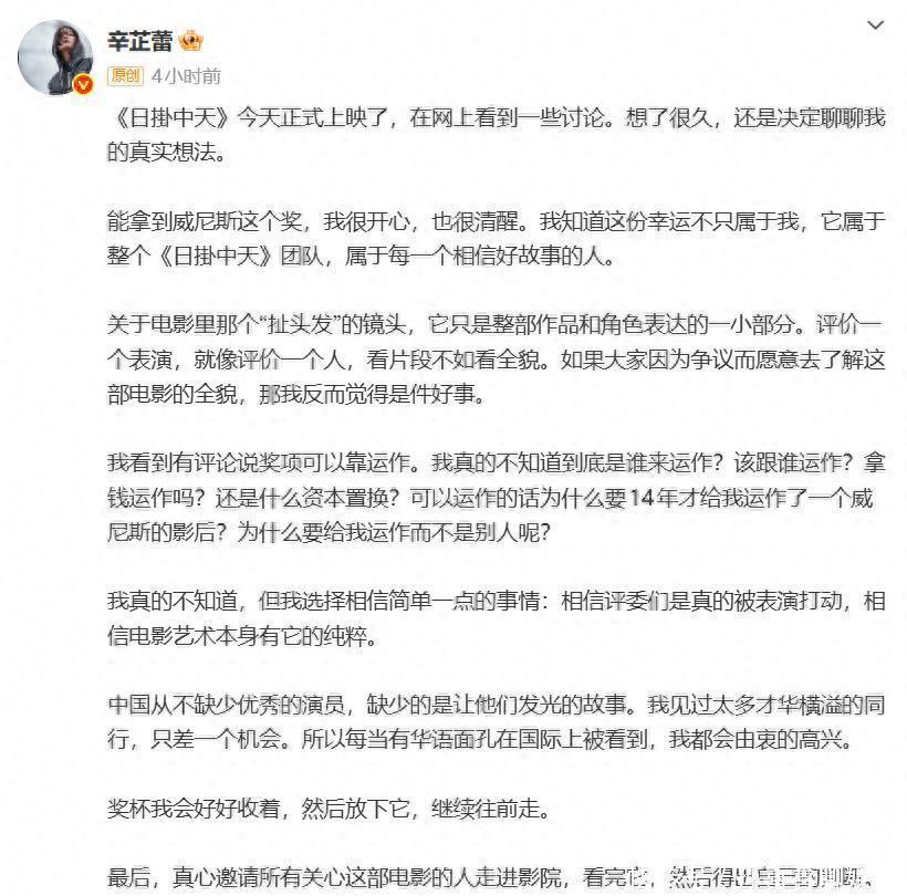 她更“诛心”地补了一句:“可以运作的话为什么14年才给我运作了一个威尼斯影后”。